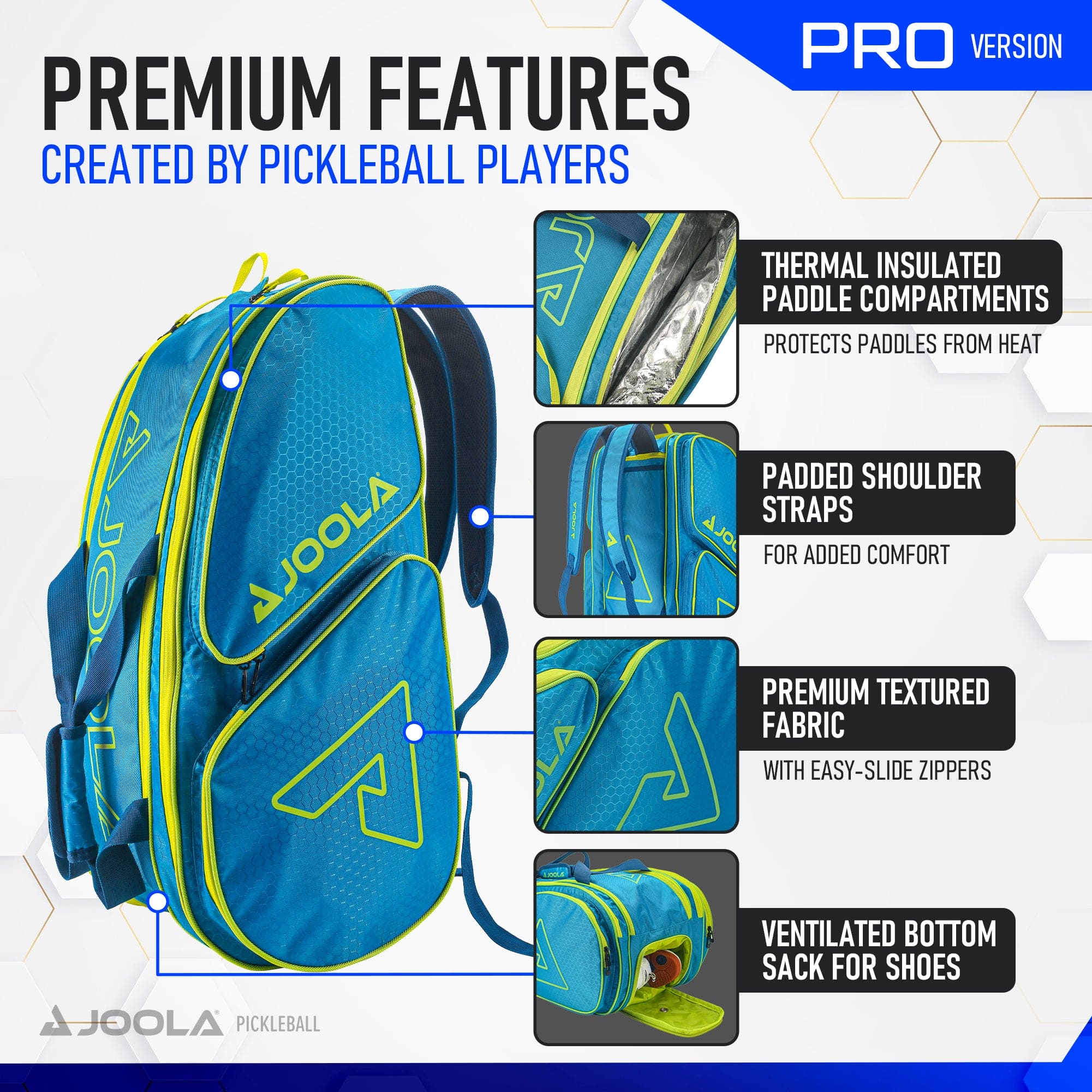 The JOOLA Tour Elite Pickleball Bag is the big pickleball paddle bag you’ll see JOOLA’s pickleball players using. With room for all of your pickleball equipment, this bag will hold everything you need for a full day at the courts. Or use it as carry-on luggage to keep all of your pickleball paddles, pickleball balls, and gear as close as can be on the way to tournaments or a pickleball vacation. The Tour Elite Bag is heavy on features and utilities. This includes the standard for any pickleball bag, a big, strong hook for attaching to the fence along with a pocket for it to hideaway. If you ever have to leave your pickleball paddle in the car or play where it gets hot, the thermal lined paddle compartments protect your rackets from extreme heat. You will also appreciate the dozen or so different storage areas to keep even the biggest pack rat or pickleball gear junkie organized and ready to play. It can even transform itself from a backpack to a pickleball duffle bag, just tuck the backpack straps in the special sleeve.
